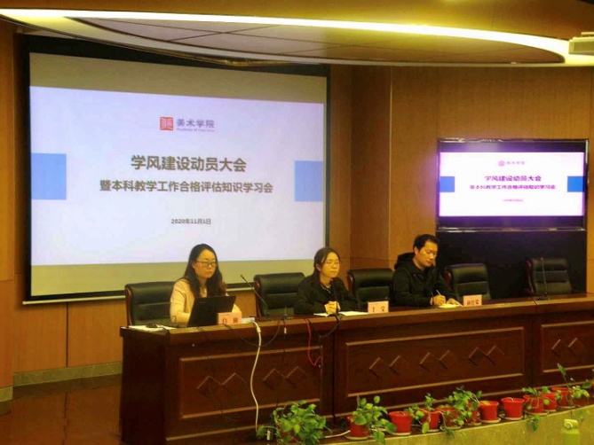 11月1日下午,美术学院学风建设动员大会暨本科教学工作合格评估知识学习会在现代教育技术楼二楼报告厅顺利召开。美术学院党总支书记丁莹、党总支副书记孙仕荣、学工办主任白丽出席会议。全体党员、发展对象、积极分子、学生会全体成员、班级全体学生干部参加。会议由白丽主持。