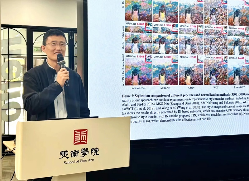 本次讲座分为三个部分:人工智能技术演进、人工智能赋能能力以及智能艺术计算案例分享。讲座开始, 路通教授以清晰的脉络梳理了人工智能技术的演进历程:从经典机器学习时代(2012年前),依托数学与统计模型,通过人工特征提取解决分类、回归等问题,强调可解释性但依赖高质量数据。深度学习崛起(2012-2020),以CNN、RNN、GAN为代表的多层神经网络实现自主特征学习,显著提升模型泛化能力,推动图像识别、自然语言处理等领域突破。大模型生产力革命(2021至今)参数量激增的通用模型(如GPT系列、Gemini)支持多模态输入/输出,实现跨任务协同。路通教授特别指出,GPT-4o等模型已具备原生图像生成与文本嵌入功能,为艺术创作提供全新工具链。路通教授以图片的形式向师生们直观呈现AI从单一任务到开放世界通用模型的跨越式发展。在智能艺术计算这一部分,路通教授重点探讨了AI在艺术领域的三大赋能方向。多模态生成能力:如GPT-4o整合图像生成与语义理解,支持风格迁移、图文交互编辑;开放世界模型应用:统一处理文本、图像、声音等多维数据,降低艺术算法研发门槛;教育创新场景:演示AI辅助设计、舞蹈编排、影视特效等案例,激发学生跨界想象力。